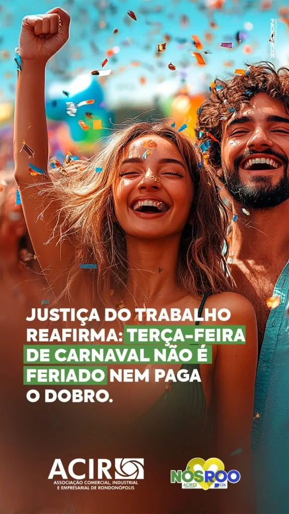 A decisão confirma a orientação técnica já divulgada pela ACIR aos seus associados: em Rondonópolis, a terça-feira de Carnaval é dia útil normal para todos os segmentos, salvo disposição específica em convenção coletiva da categoria.
